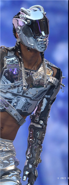 Spesso attorniata da almeno una dozzina di ballerini, ecco che “Bey” (letto: bii) dal palco centrale cammina come una modella sulla lunghissima passerella, in un florilegio di luci, fumi e riprese aeree che due schermi larghi una buona cinquantina di metri consentono di gustare nei dettagli. Il tema dei costumi è “una fantasia Afro-futurista” con capi di stilisti noti (e bianchi: Alexander McQueen, Courreges, Balmain, Ferragamo, Stella McCartney) misti alla propaganda delle tute spaziali e il bot-Maria di Metropolis.